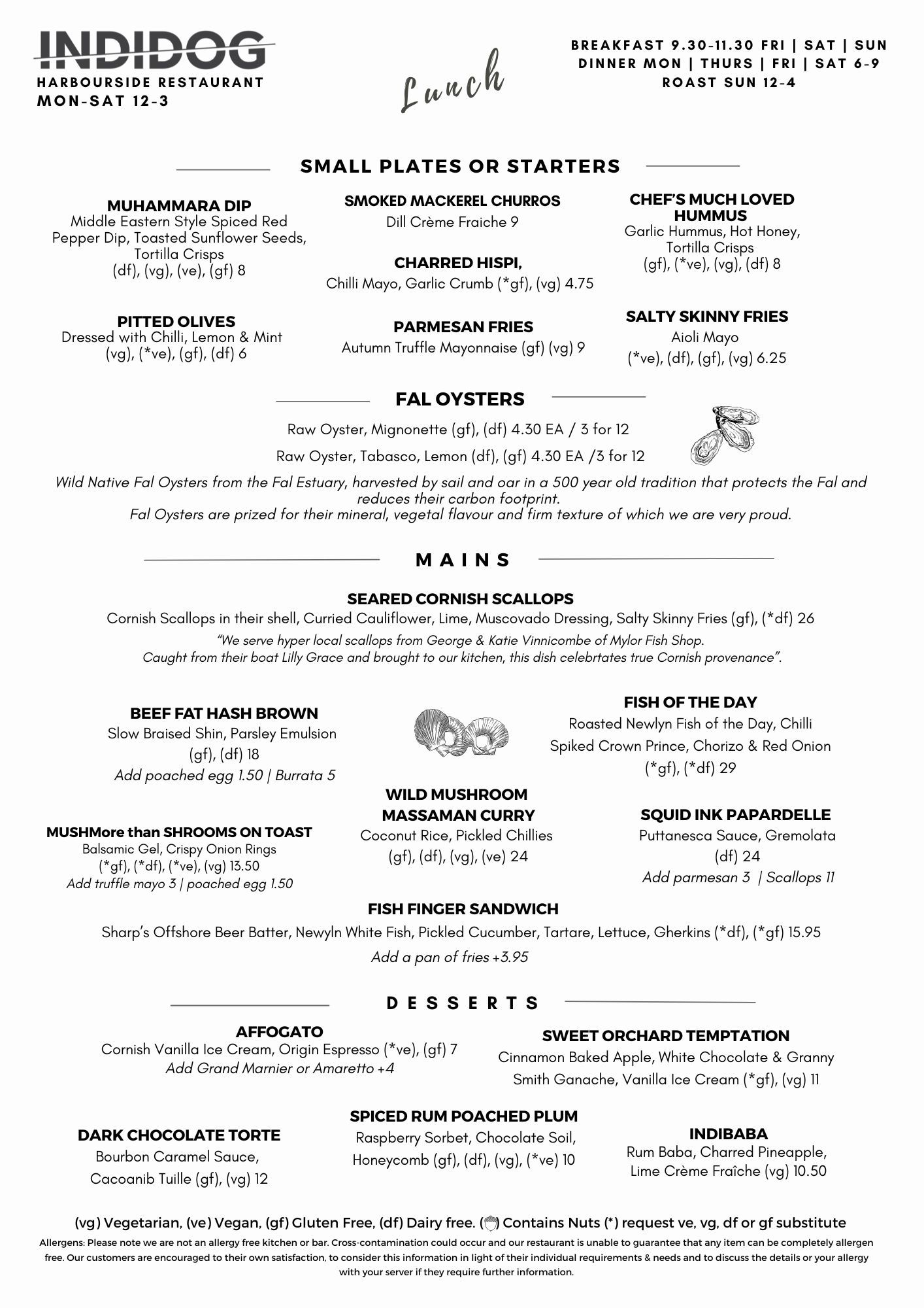 Lunch at INDIDOG celebrates modern British flavours with a strong focus on locally sourced Cornish produce. Enjoy lobster from Jamie of Mylor Fish, scallops from George & Katy of Mylor Fish Shop, or our much-loved Fish Finger Sandwich. Relaxed, accessible premium dining right by the water.
