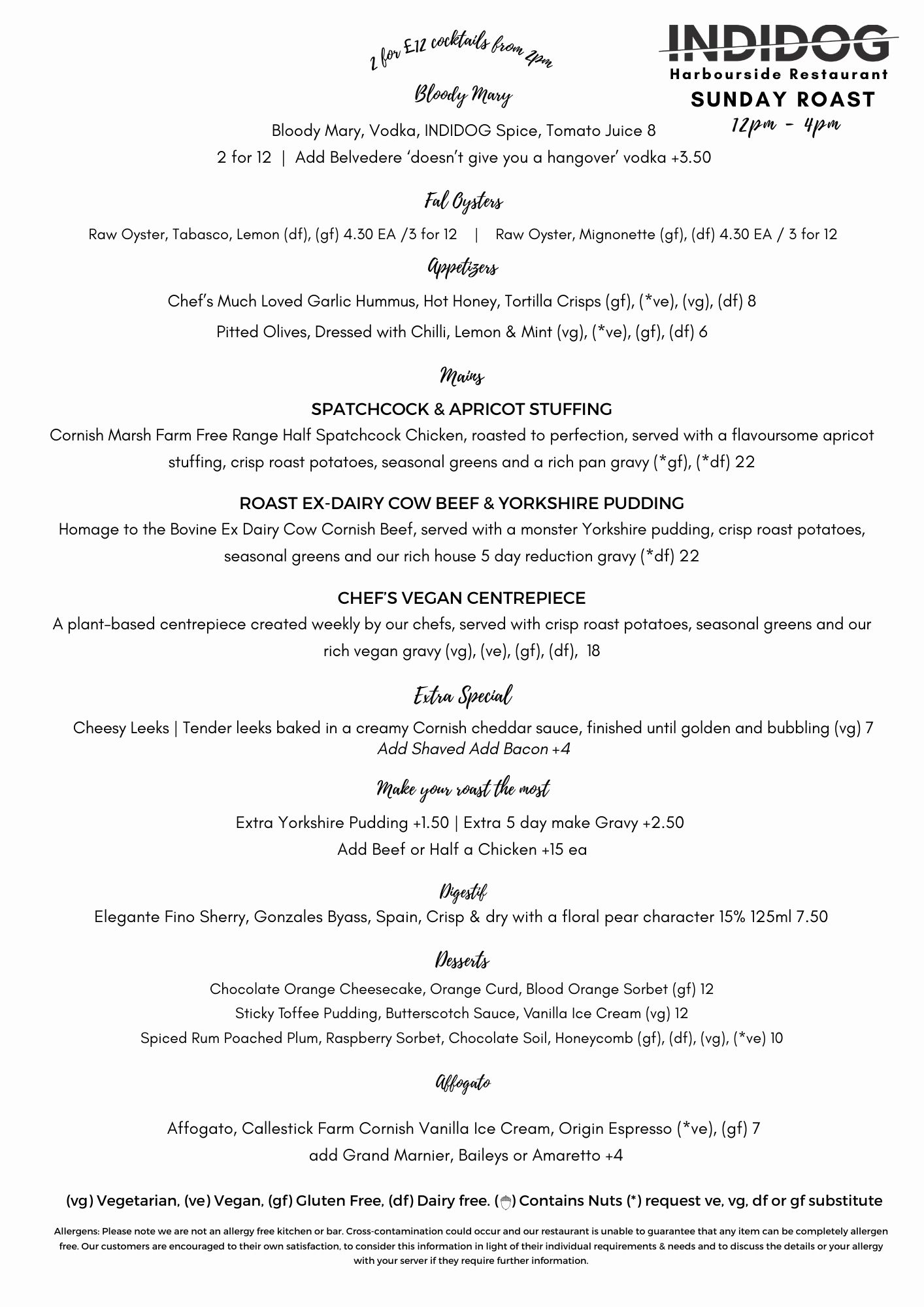 Round off the weekend with your favourite people over a harbourside roast at INDIDOG. Cornish beef or free range chicken, monster yorkies and a bloody Mary to pep you up.